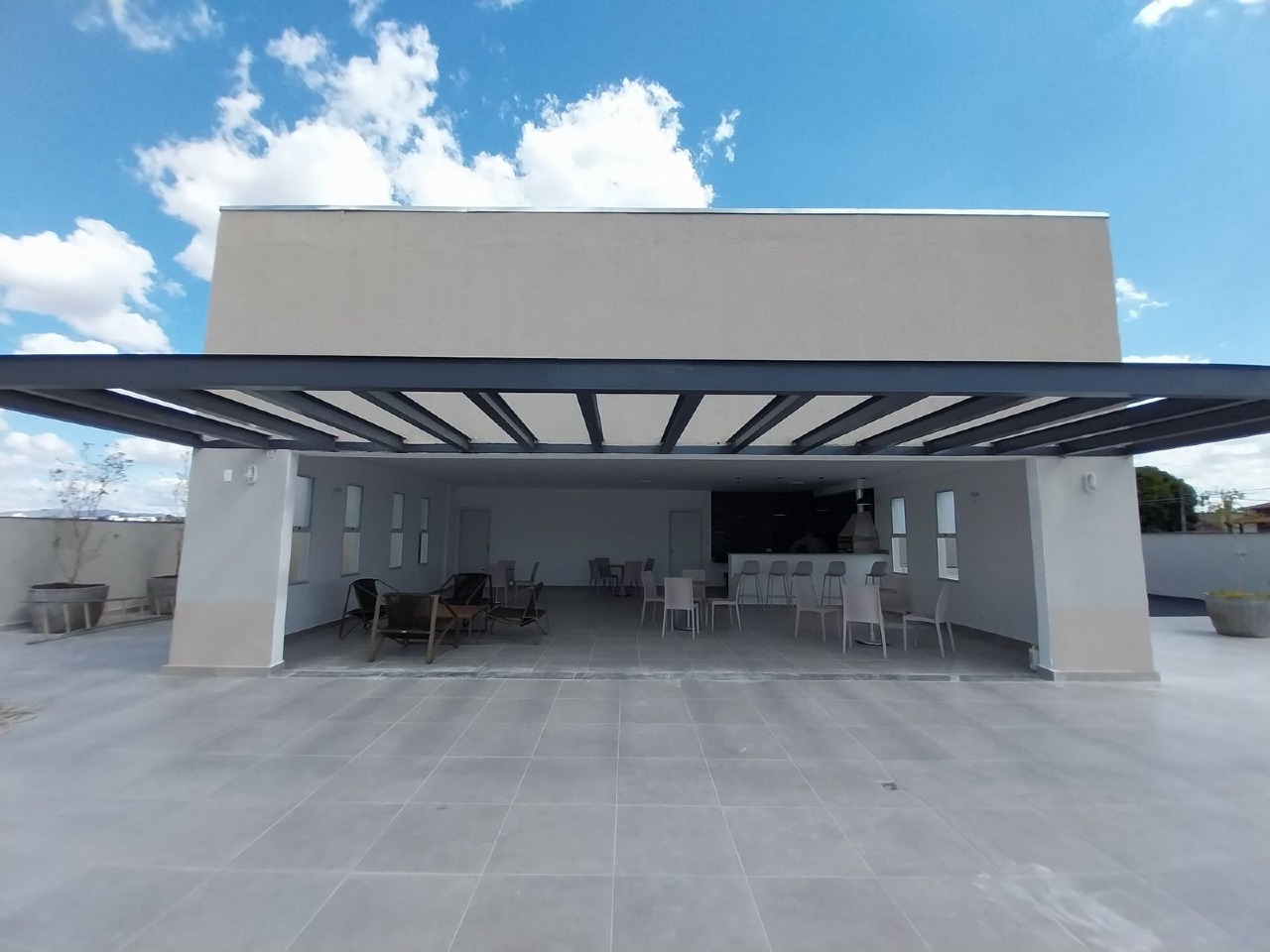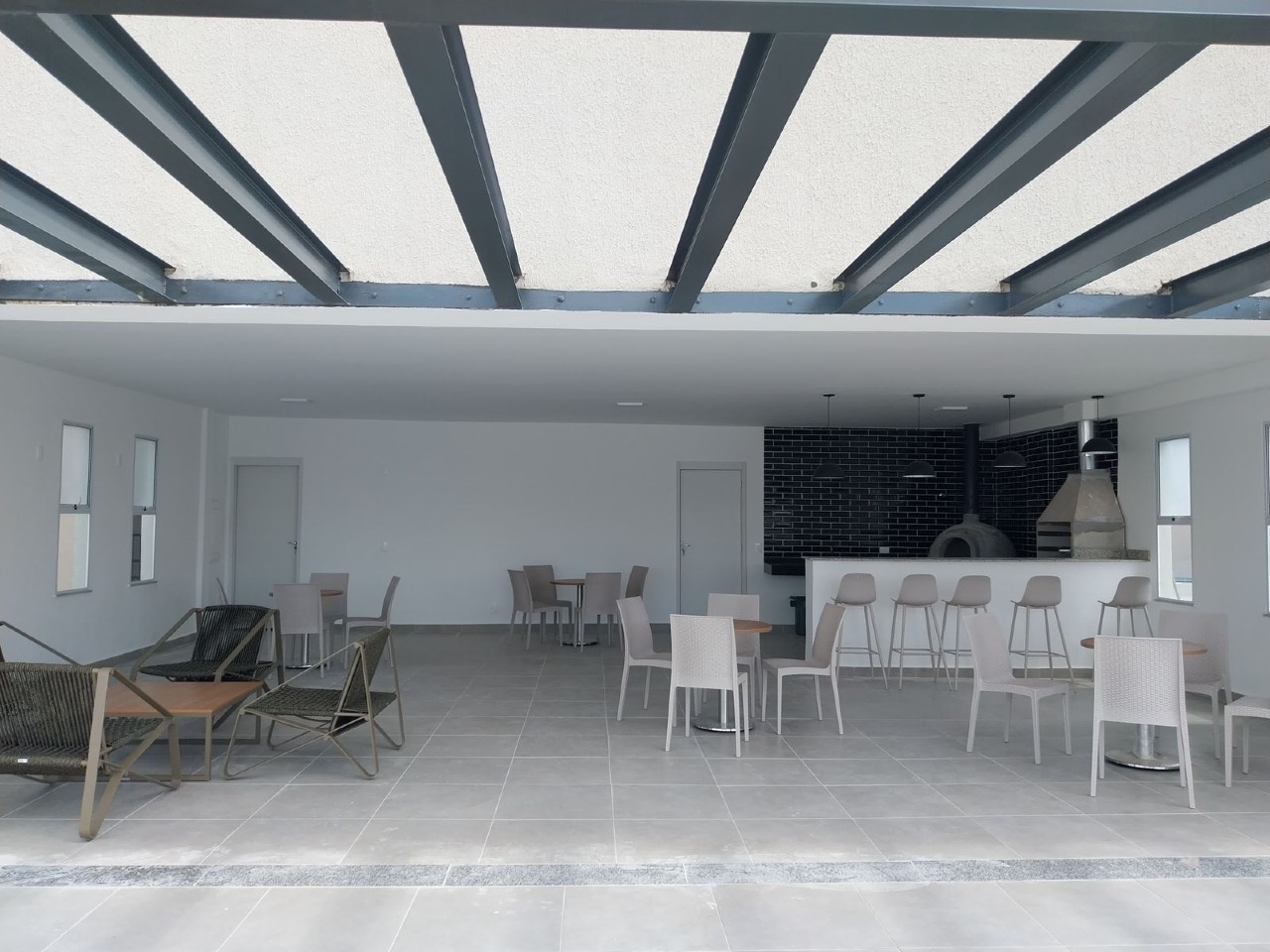 Salão de festas com churrasqueira e forno de pizza