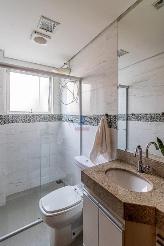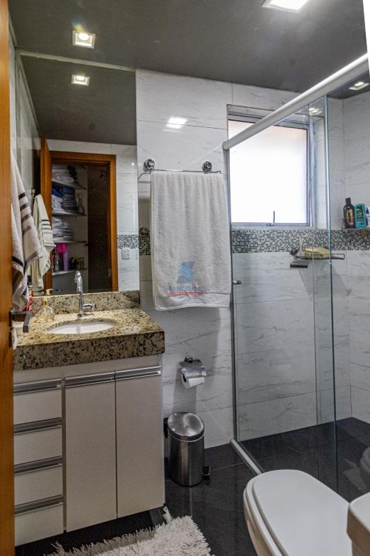 01 Banheiro social com bancada em granito, box e acabamento em porcelanato