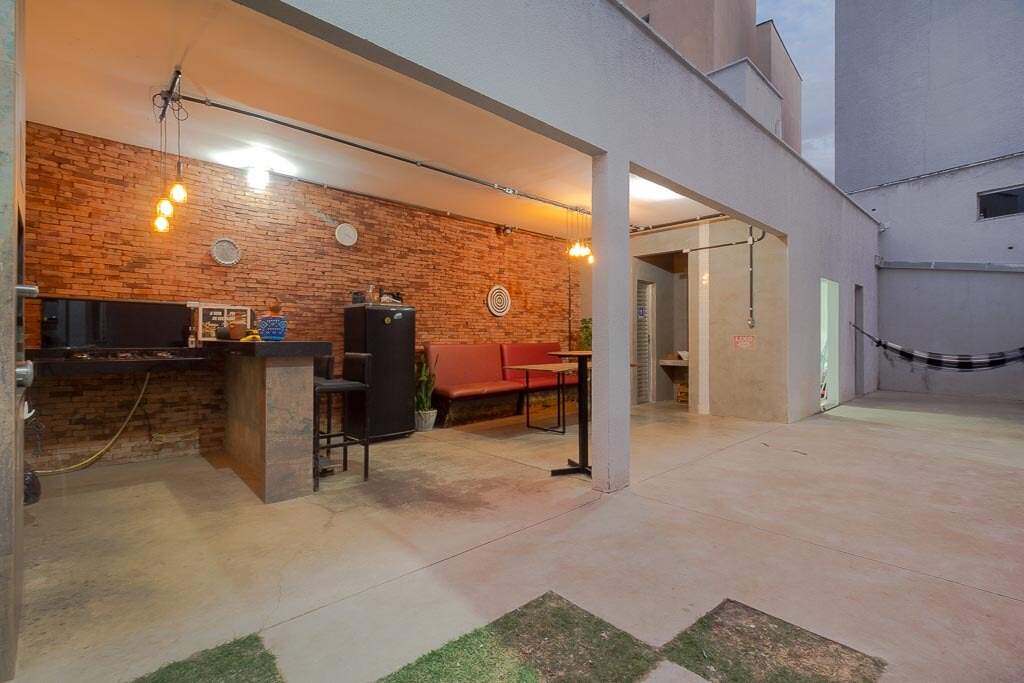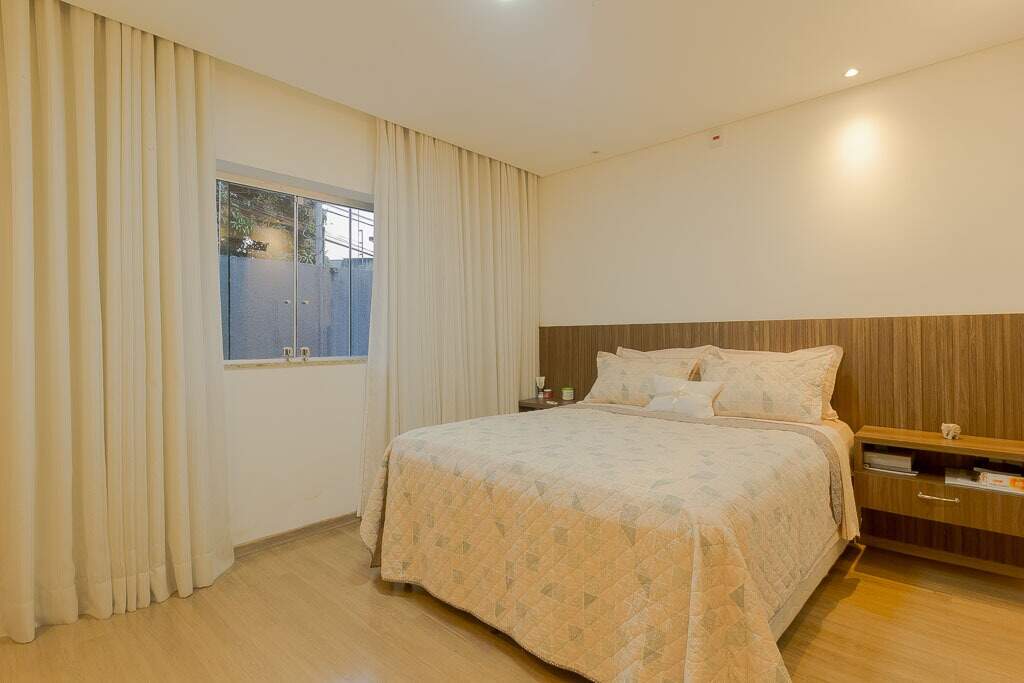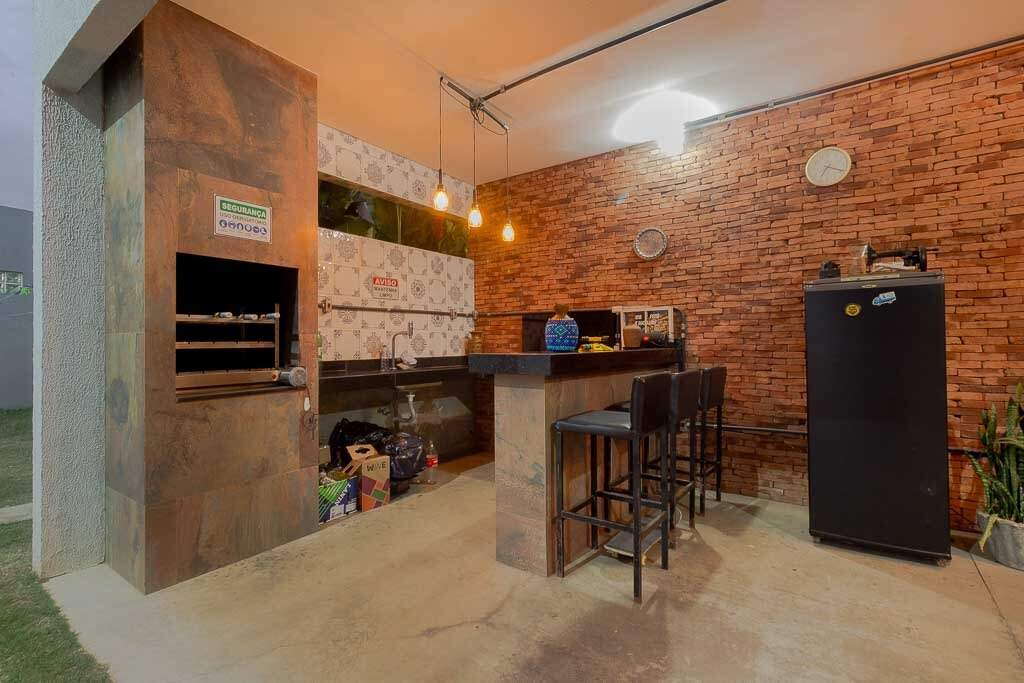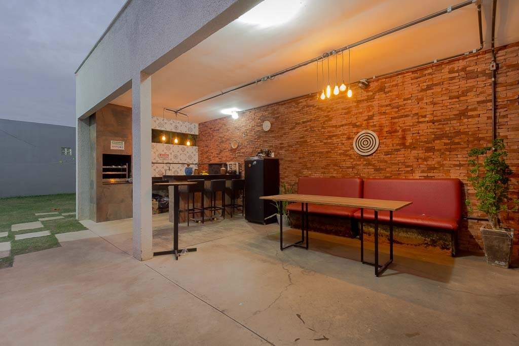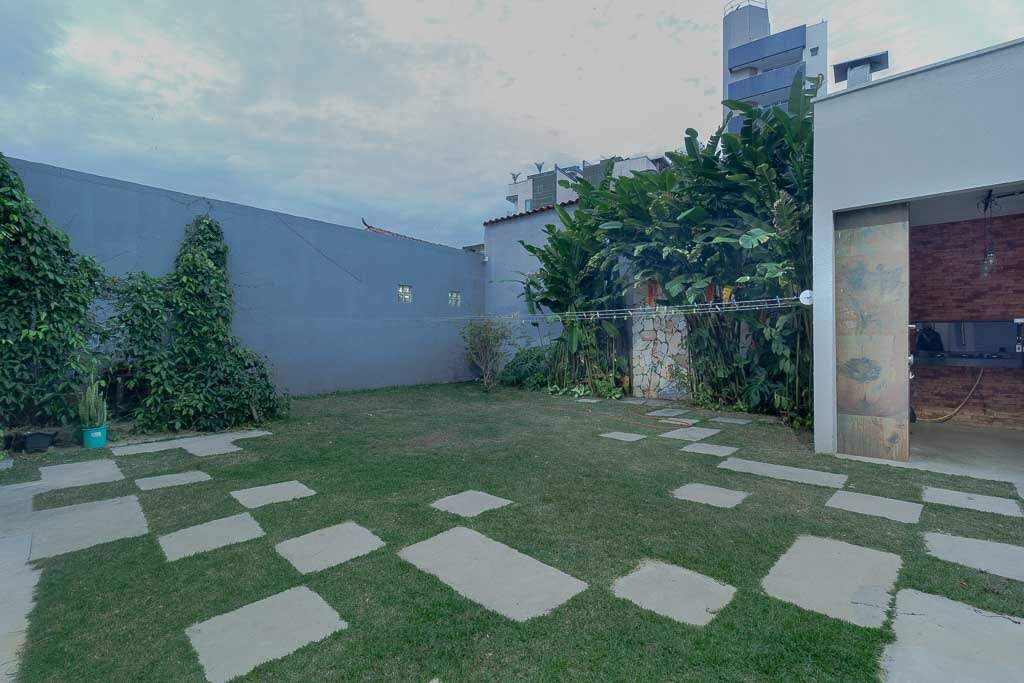 Quintal amplo com área gramada, jardim, área gourmet com churrasqueira, 2 banheiros, lavanderia, quarto de despejo, garagem para até 4 veículos pequenos, sistema de segurança com câmeras, controle de acesso biométrico, iluminação.