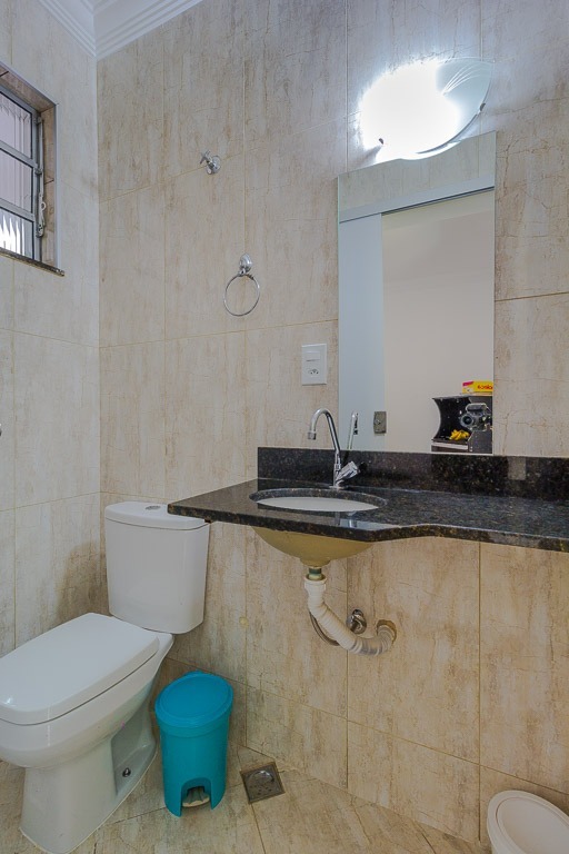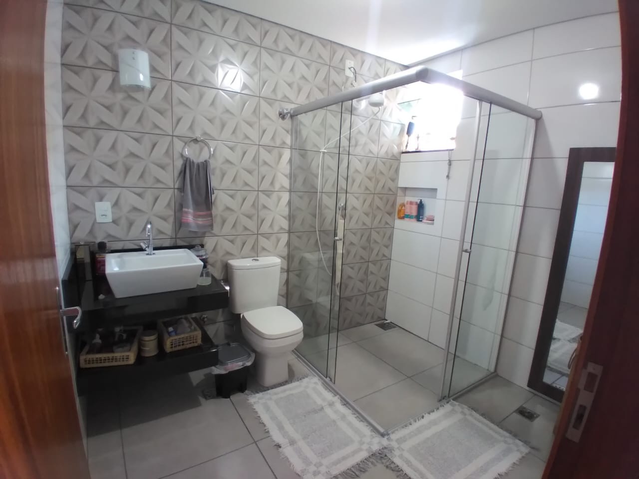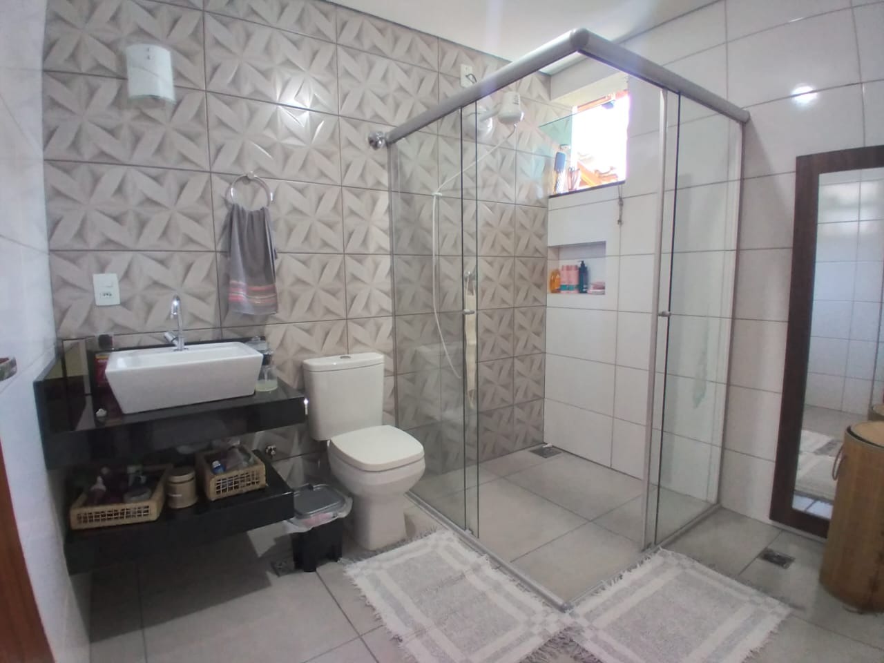 Banho social revestido até o teto com box de blindex