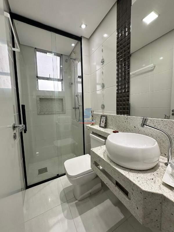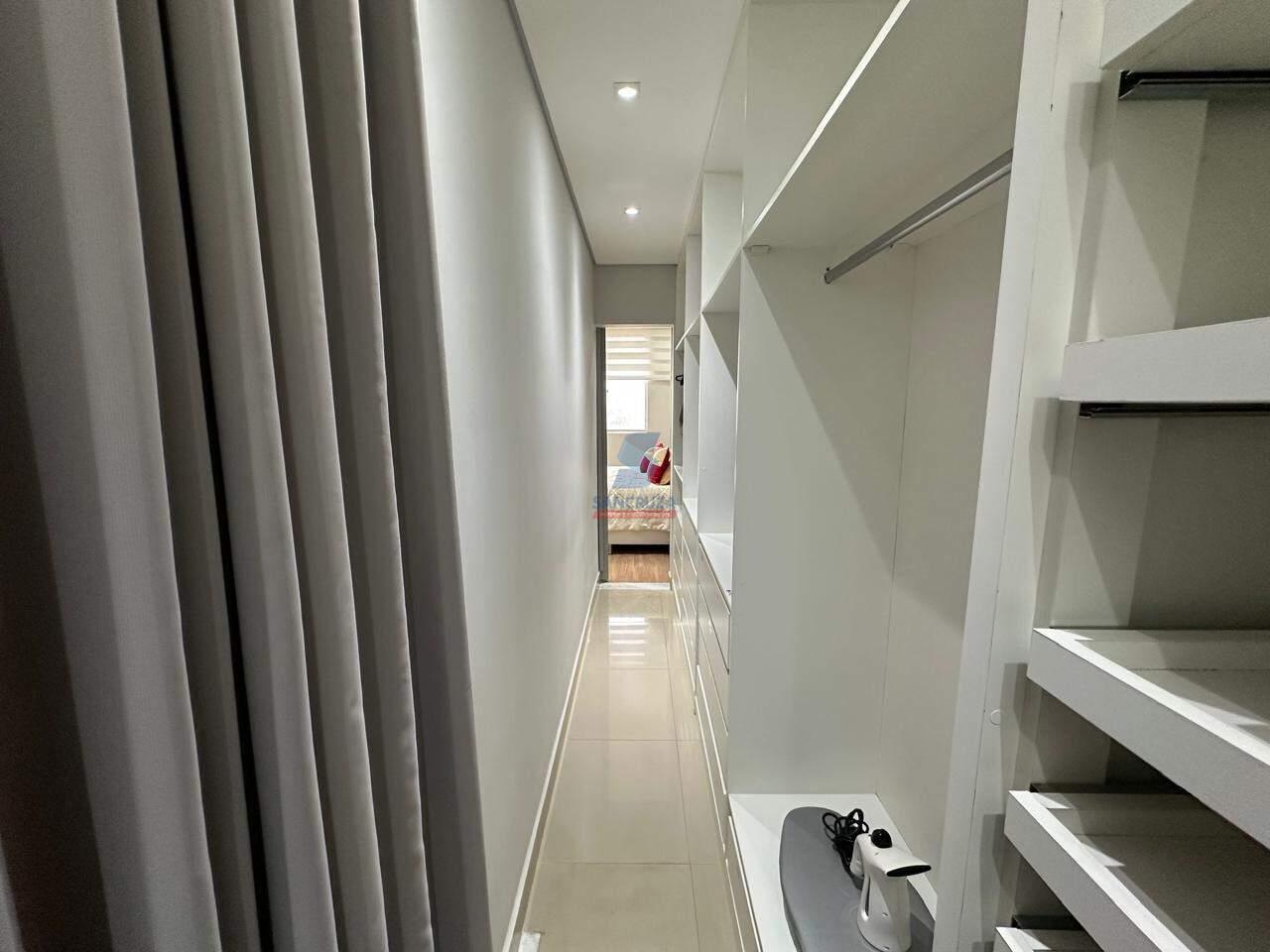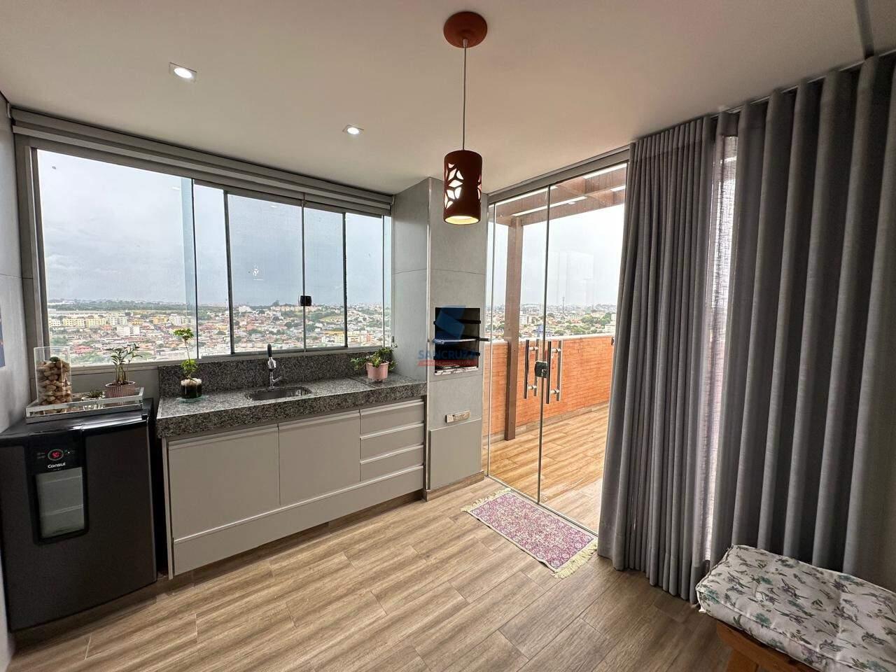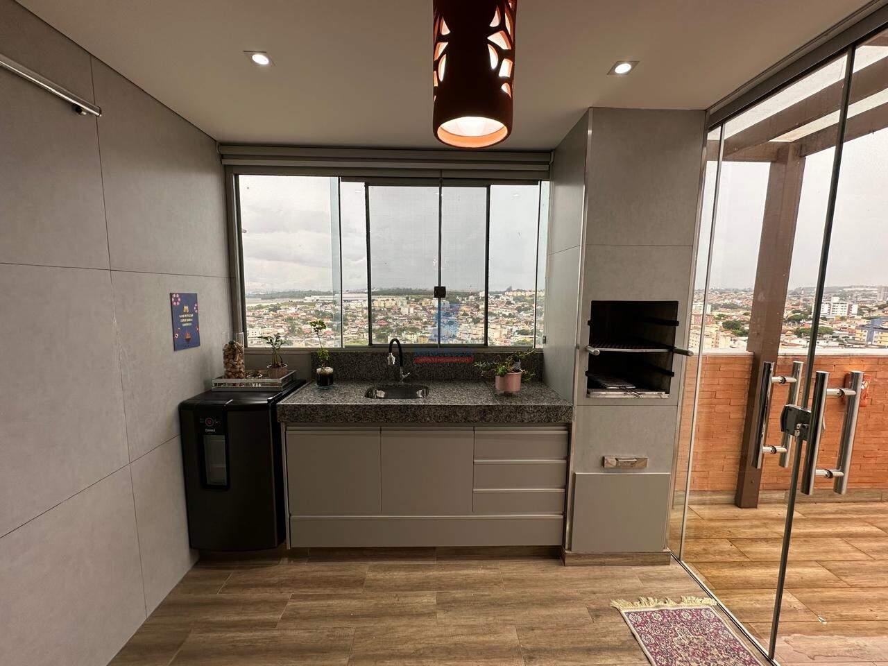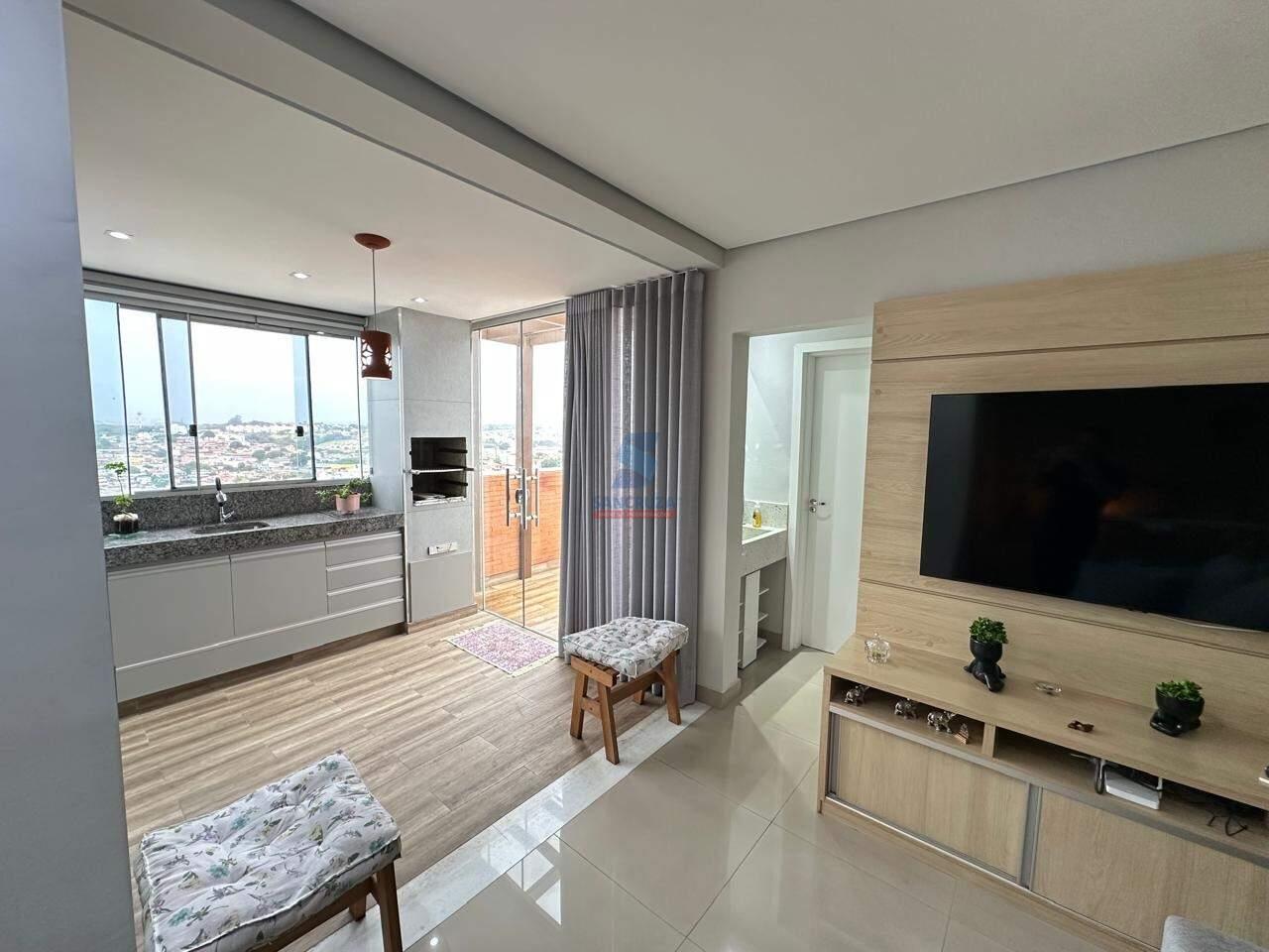 APARTAMENTO com aproximadamente 127,57m², piso em porcelanato e laminado, luminárias, rebaixamento em gesso, persianas e cortinas, quadros, objetos de decoração, ar-condicionado, 3 quartos sendo 2 com armários planejados, cozinha com armários planejados, área de serviço, espaço gourmet com churrasqueira, cobertura com vista definitiva e ducha. 2 banheiros com box, chuveiro e nicho sendo 1 com armários. Fino acabamento.