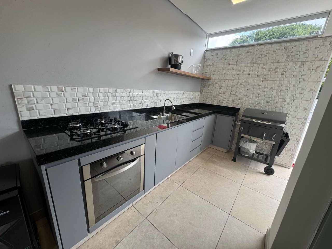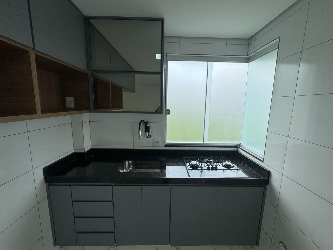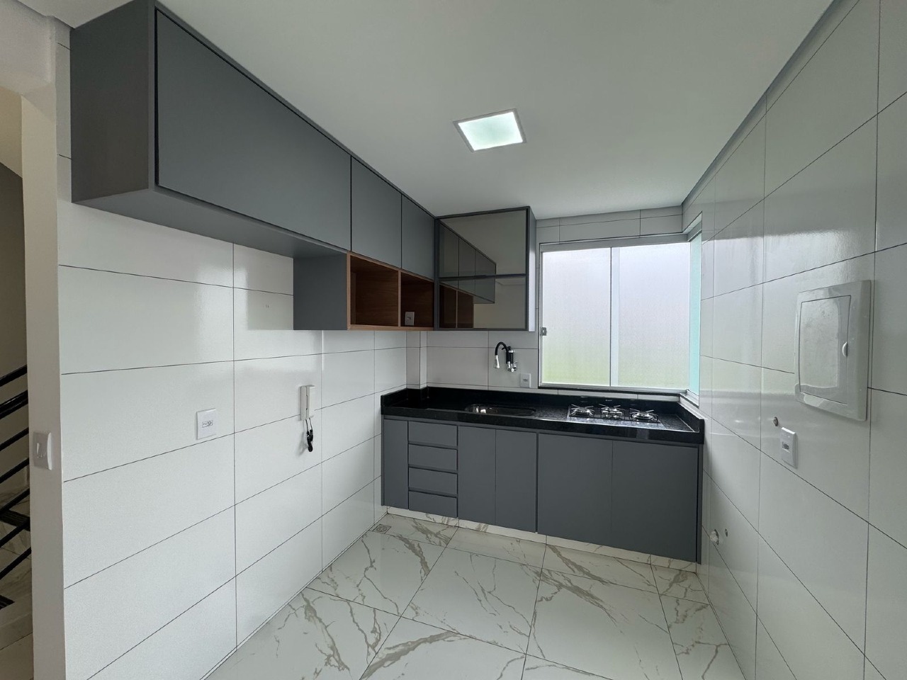•1- Cozinha toda Revestida em com Piso em Porcelanato e Cerâmica nas Paredes com Bancada em Granito.