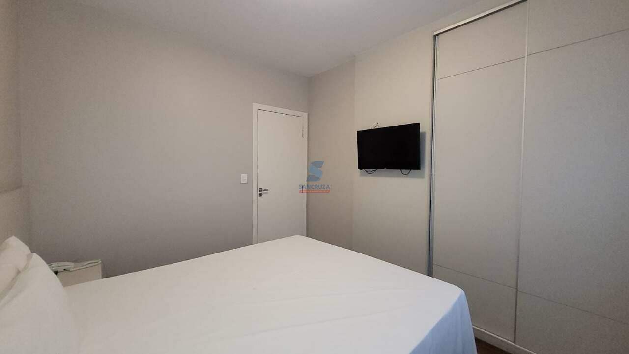 01 Quarto, com armário planejado, ar condicionado, TV, cama e cortina, piso em laminado.